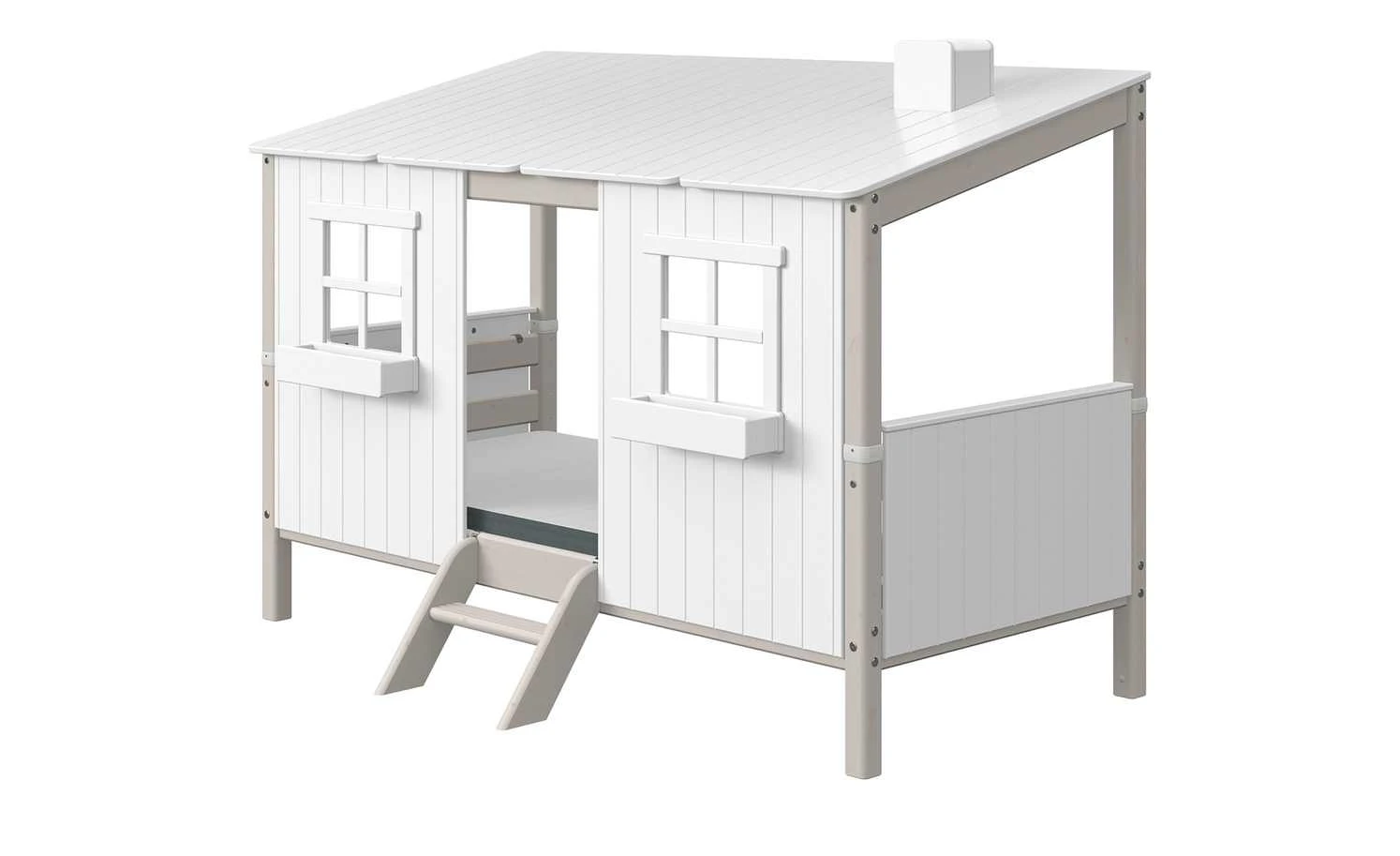 Ein Haus mitten im Kinderzimmer? Das geht mit dem Bettgestell Flexa Classic Haus von der Marke FLEXA. Das Bettgestell hat ein liebevoll gestaltetes Hausdesign mit ganz vielen Details. Dazu gehören Dach mit Schornstein, ein Eingang mit Leider und Fenster. Letzter haben einen kleinen Blumenkasten der hübsch dekoriert werden kann. Wie alle Artikel der Marke FLEXA, ist auch das Haus aus besten Materialien – wie massiver Kiefer – gefertigt. Deshalb ist es mit diversen Gütesiegeln ausgezeichnet. Praktisch: Der passende Lattenrost ist im Lieferumfang enthalten. Eine Matratze in 90 x 200 cm Größe ist separat erhältlich.