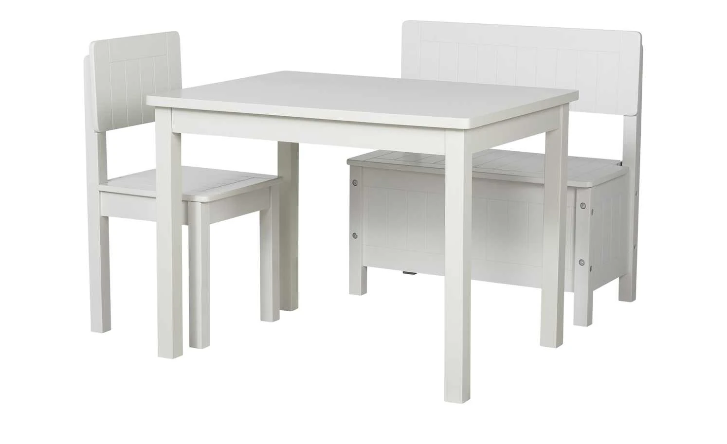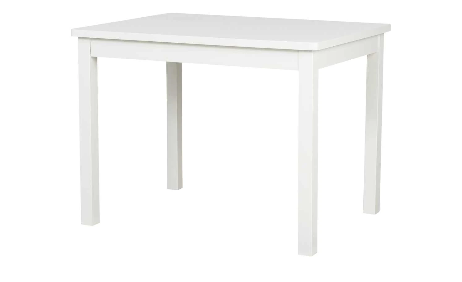 Der in klassischem Weiß gehaltene Kindertisch ist ein solides Möbelstück für das Kinderzimmer. Die Krummteile des Tisches sind aus Massivholz hergestellt und sorgen für die nötige Standfestigkeit. Die weiße Lackierung verleiht dem Tisch eine klassische Eleganz.