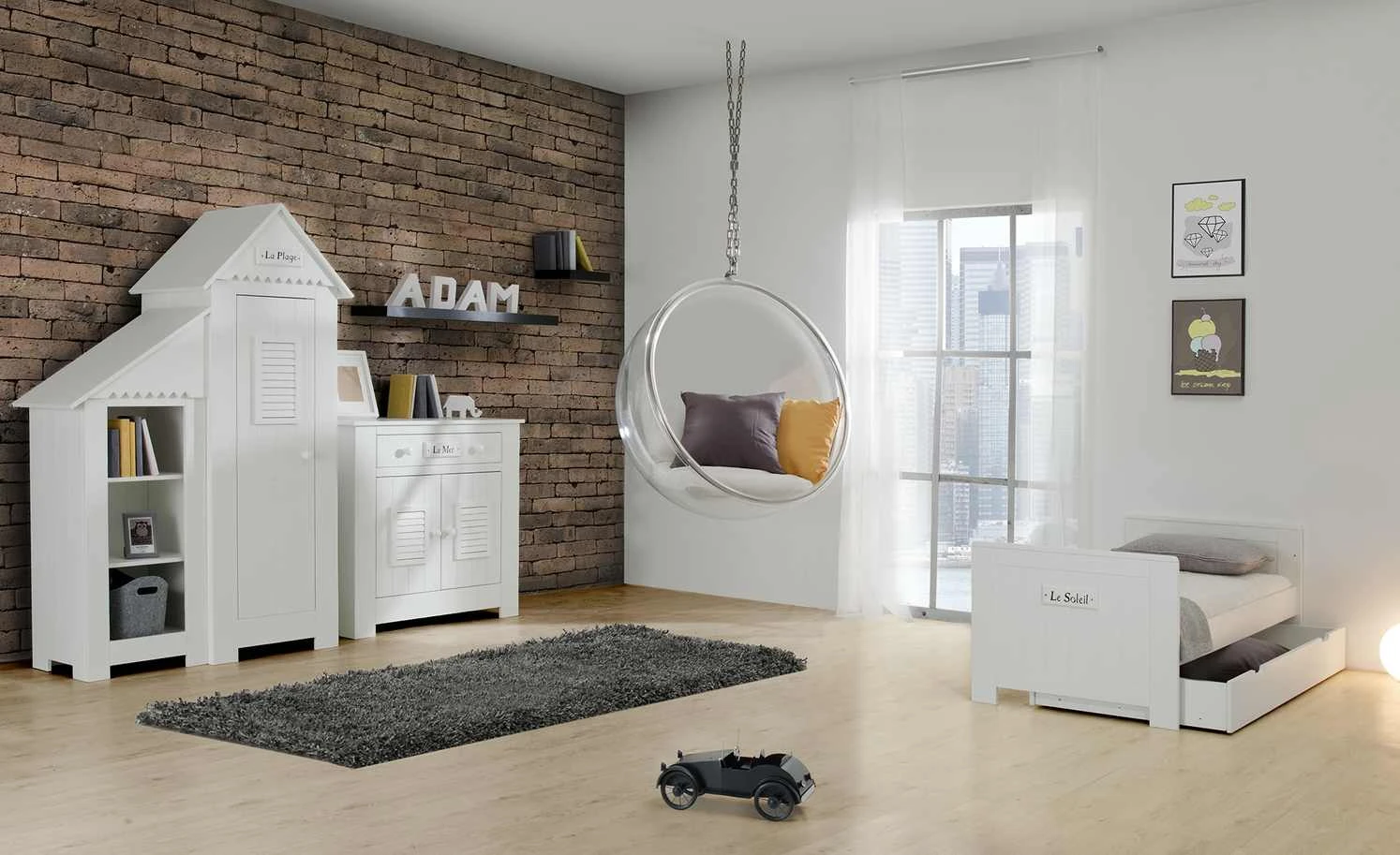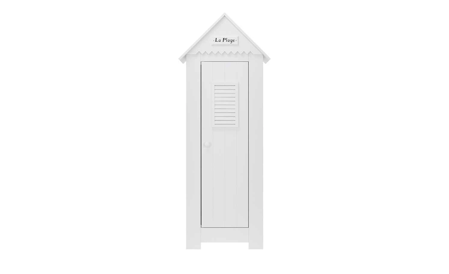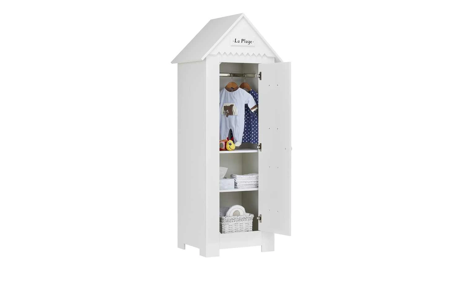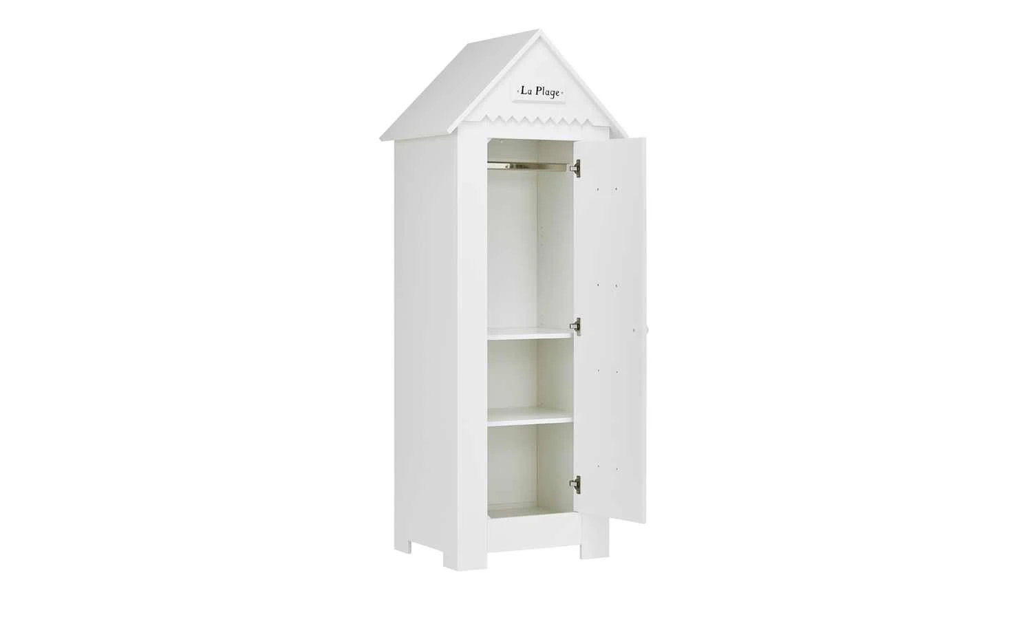 Wie eine kleine Strandhütte sieht der Kleiderschrank Mara aus. Er hat ein spitzes Dach und eine Holzlattenoptik. Auf der Vorderseite befindet sich eine Dekoleiste mit dem Schiftzug „La Plage“ – „Der Strand“. Front, Korpus und Dach sind hochwertig lackiert und haben einen schönen Weißton. Hinter der Tür ist Mara mit einer Kleiderstange und zwei Böden ausgestattet. Die Tür selbst verfügt über Soft-Close für leises Schließen.