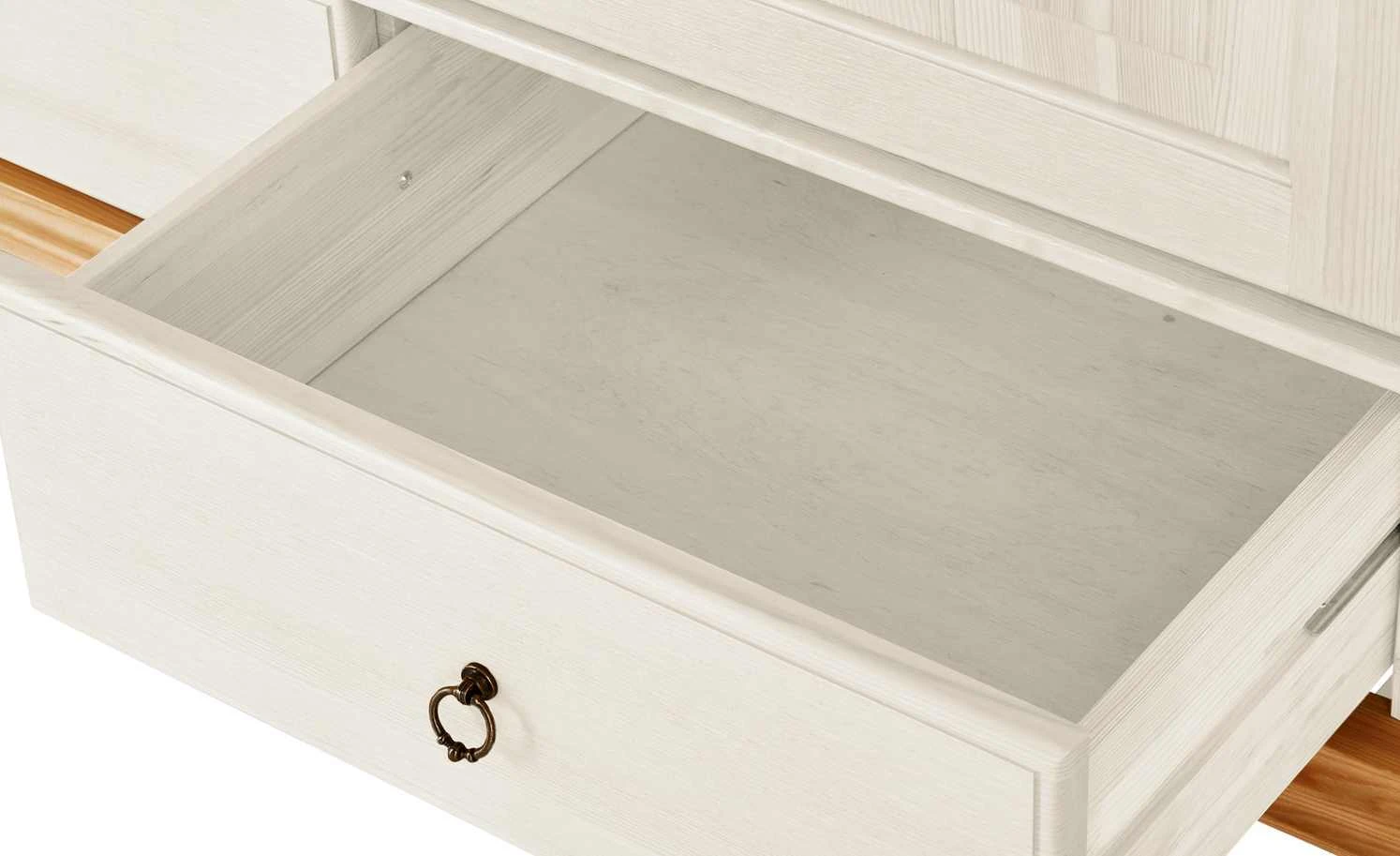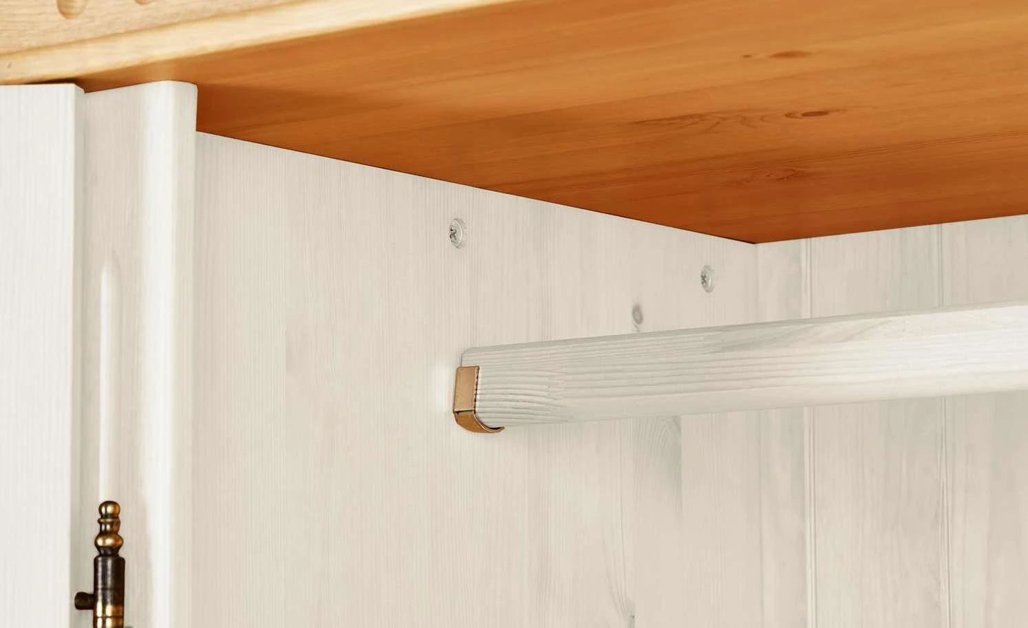 Mit ihrem Landhauscharme bringt die Serie Bornholm ein gemütliches Flair in das Babyzimmer. Dieser dekorative Schrank ist Teil der Serie. Er besteht aus massivem Kiefernholz und ist detailreich verziert. Die Oberflächen sind gewachst, wodurch der Schrank ein weißes Finish erhalten hat. Kranz, Boden und Füße sind antikfarben gewachst und lackiert. Ein toller Kontrast zum Weiß. Die holztypische Maserung schimmert durch alle Oberflächen hindurch, was dem Landhausdesign eine natürliche Note gibt. Hinter den beiden großen Türen steht dir eine Kleiderstange zur Verfügung. Unterhalb der Türen sind außerdem zwei Schubladen zu finden. Die beiden können wahlweise mit Holz- oder Metallgriffen ergänzt werden. Alle vier sind im Lieferumfang enthalten.