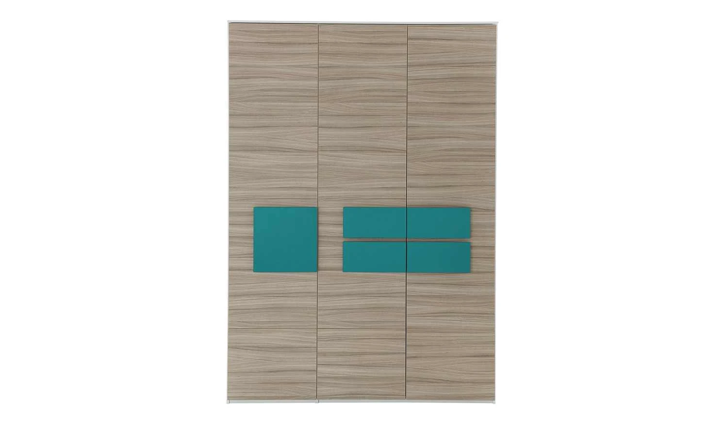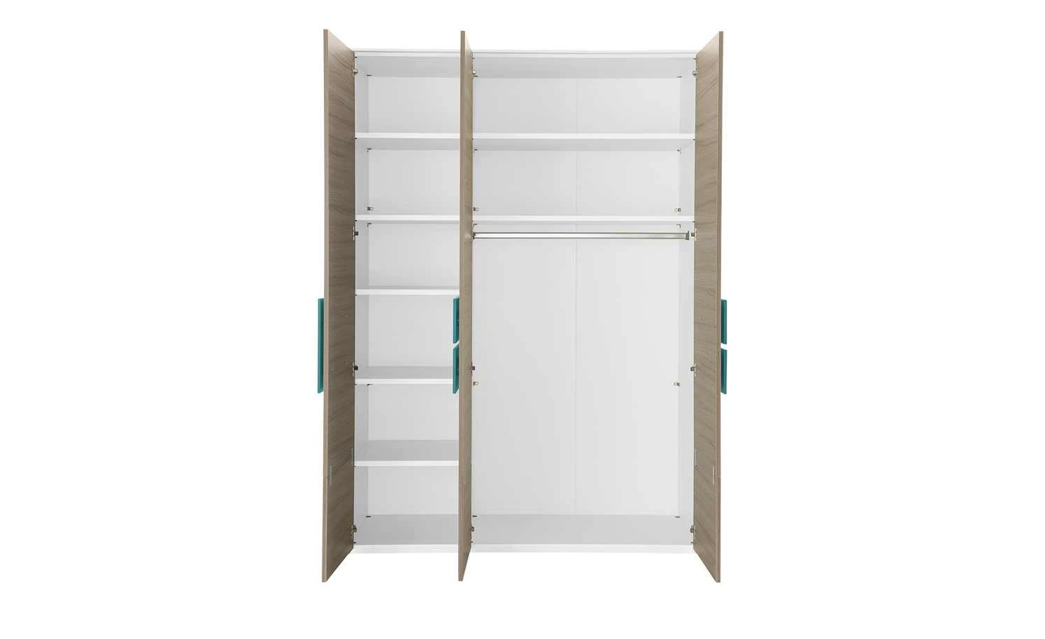 Für Ordnung im Kinder- und Jugendzimmer sorgt der Kleiderschrank Holly. Er ist mit drei Türen ausgestattet – und viel Stauraum dahinter. Der Schrank hat sechs kleinere und zwei große Fächer. Die Kleiderstange können Sie zum Aufhängen von Kleidung nutzen. Neben seiner Praktikabilität, ist der Schrank auch optisch attraktiv. Die quadratischen und rechteckigen Frontabsetzungen in Kontrastfarbe setzen Akzente. Genial: Gleichzeitig dienen sie als Griffe.