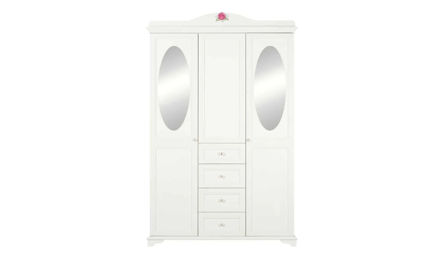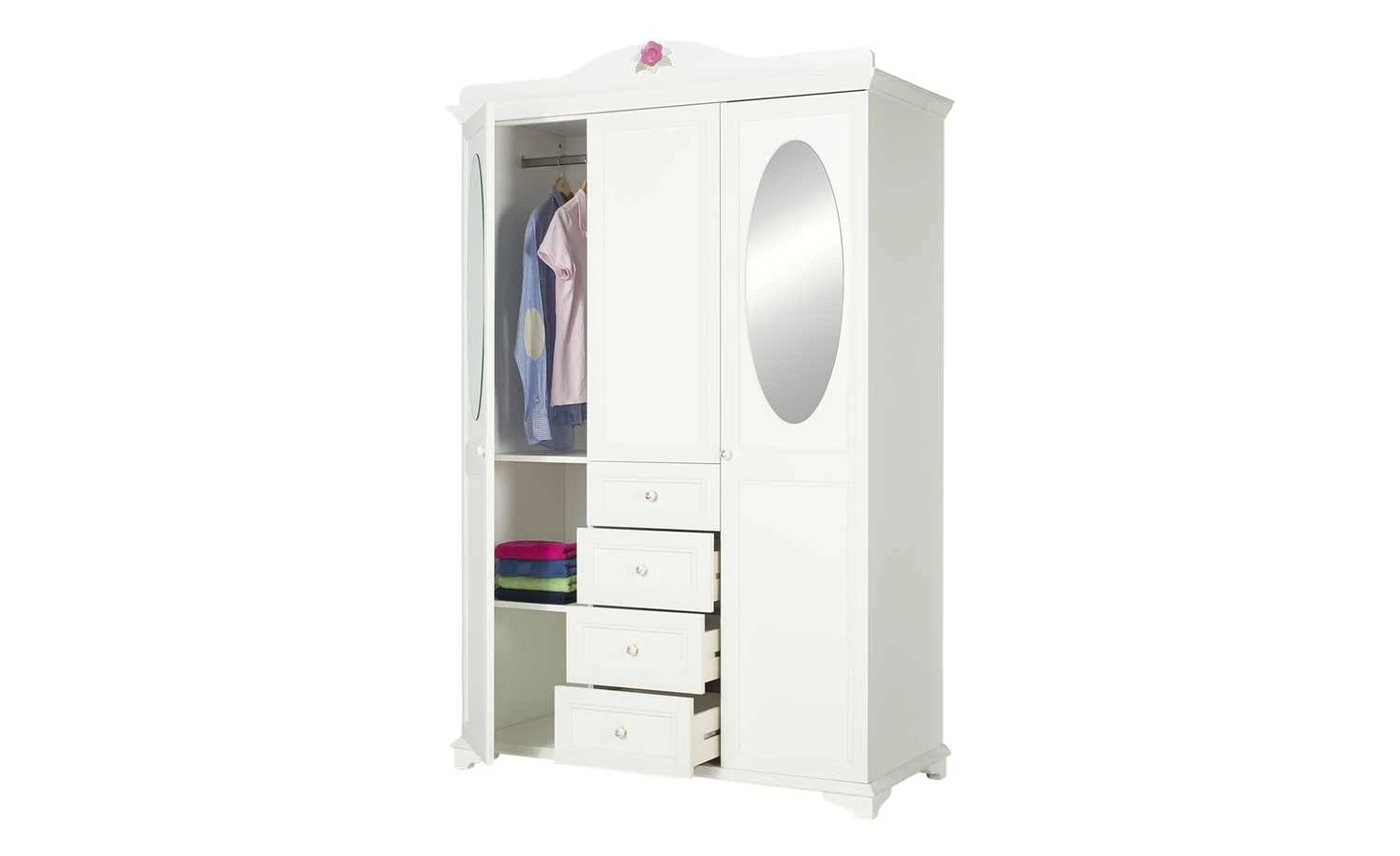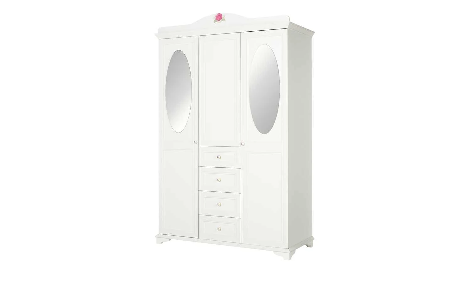 Er überzeugt nicht nur optisch. Auch funktionell bietet er viel Platz und Stauraum. Der Schrank besitzt vier Schubkästen und zwei Schranktüren mit jeweils einem ovalen Spiegel. Die abgerundete Optik und das farbige Rosenornament im oberen Bereich sowie die hochwertigen Porzellanknöpfe lassen Platz zum Träumen. Ob in Ihrem Schlafzimmer, Gästezimmer oder Jugendzimmer – dieser Schrank bietet viel Stauraum für Ihre Kleidung und einen Hauch von Romantik!