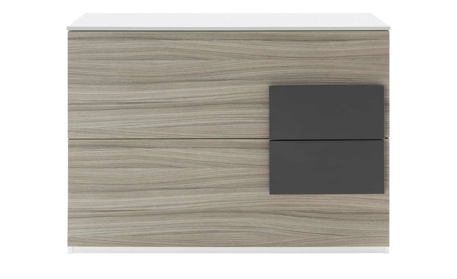 Die Kommode Holly ist mit zwei großen Schubkästen ausgestattet. Diese erstrecken sich über die gesamte Breite der Kommode und sind übereinander angeordnet. Die rechteckigen Griffe sind seitlich befestigt und setzen sich farblich ab. Die beiden Griff-Rechtecke ergeben ein Quadrat. Korpus und Front sind dank der Melaminbeschichtung strapazierfähig und pflegeleicht.