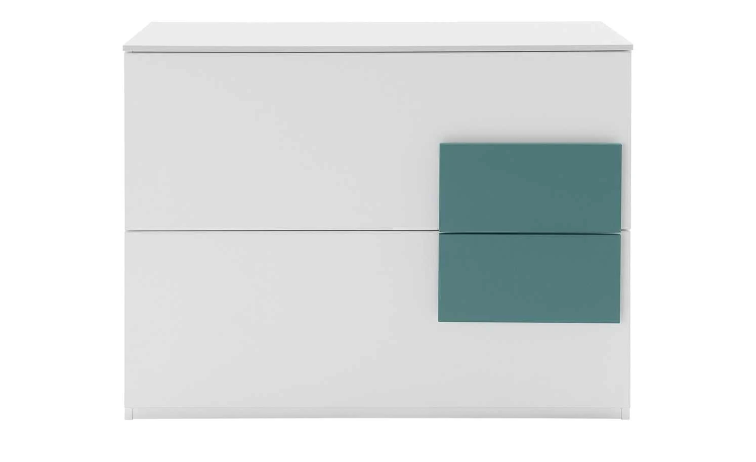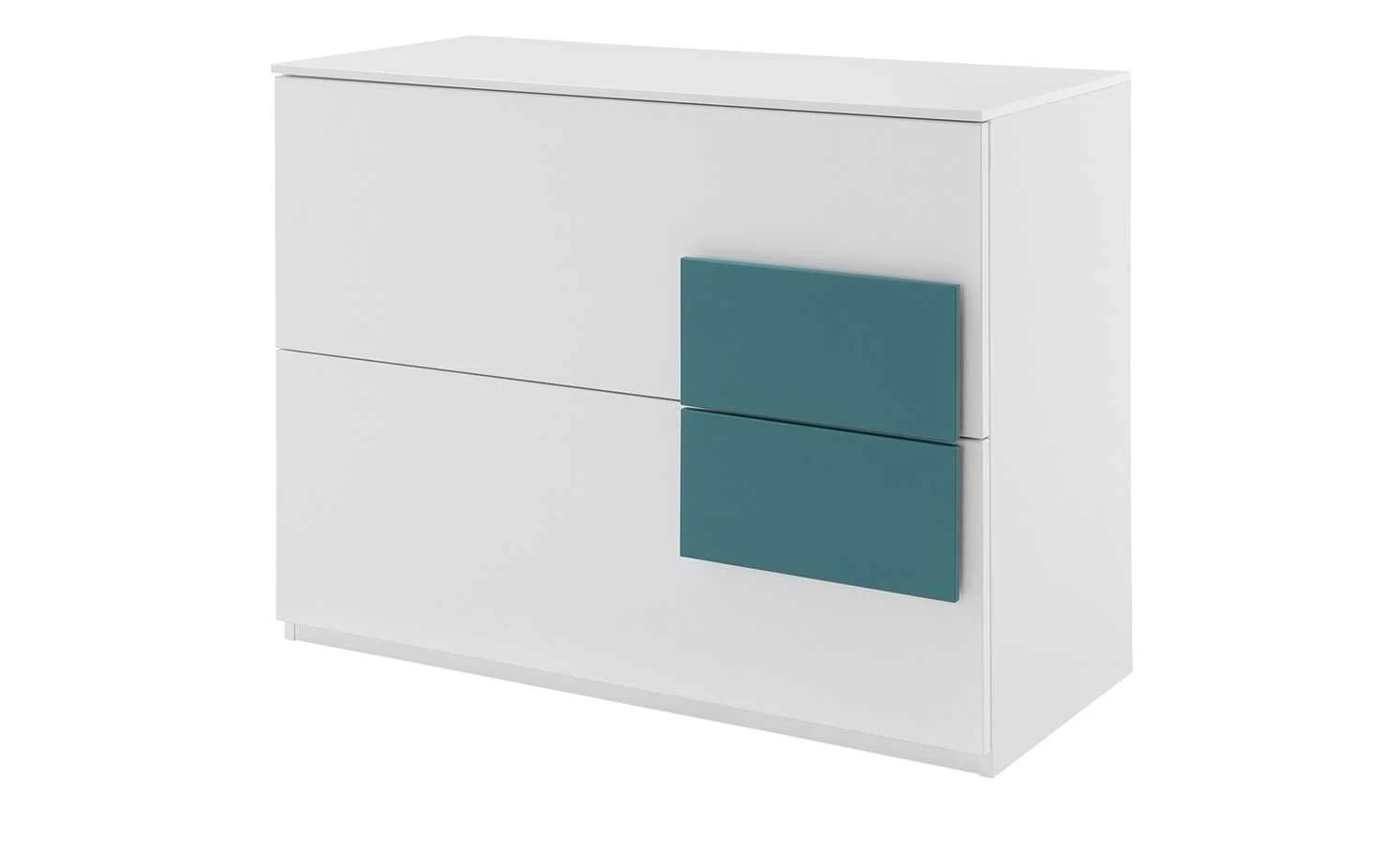 Die Kommode Holly ist mit zwei großen Schubkästen ausgestattet. Diese erstrecken sich über die gesamte Breite der Kommode und sind übereinander angeordnet. Die rechteckigen Griffe sind seitlich befestigt und setzen sich farblich ab. Die beiden Griff-Rechtecke ergeben ein Quadrat. Korpus und Front sind dank der Melaminbeschichtung strapazierfähig und pflegeleicht.