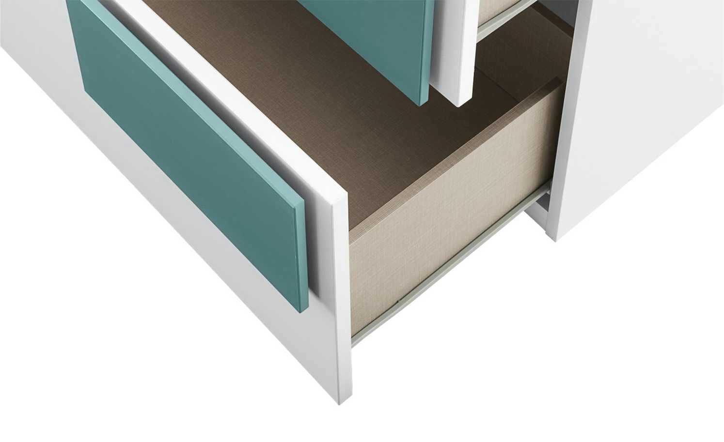 - Mehr zur Ausführung: Türen mit farbig abgesetzten Griffapplikationen, Schubkastenzargen in Textilstruktur Grau