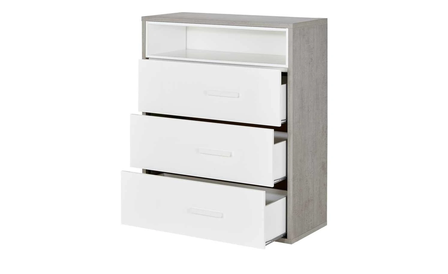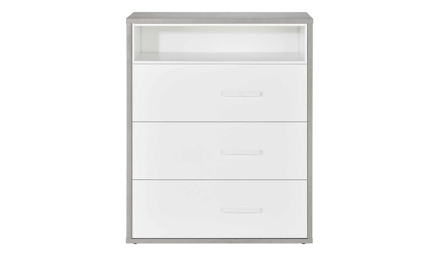 Die Kommode Milow ist praktisch für das Jugendzimmer. Sie verfügt über drei Schubladen und ein offenes Fach. Die Front fällt durch ihren Hochglanz in Weiß auf. Ein interessantes Detail sind die etwas seitlich angebrachten weißen Griffe. Der Korpus steht im Kontrast zur Front. Er hat eine auffällige Betonfarbe. Die Kommode können Sie mit den anderen Möbeln der Serie ergänzen.