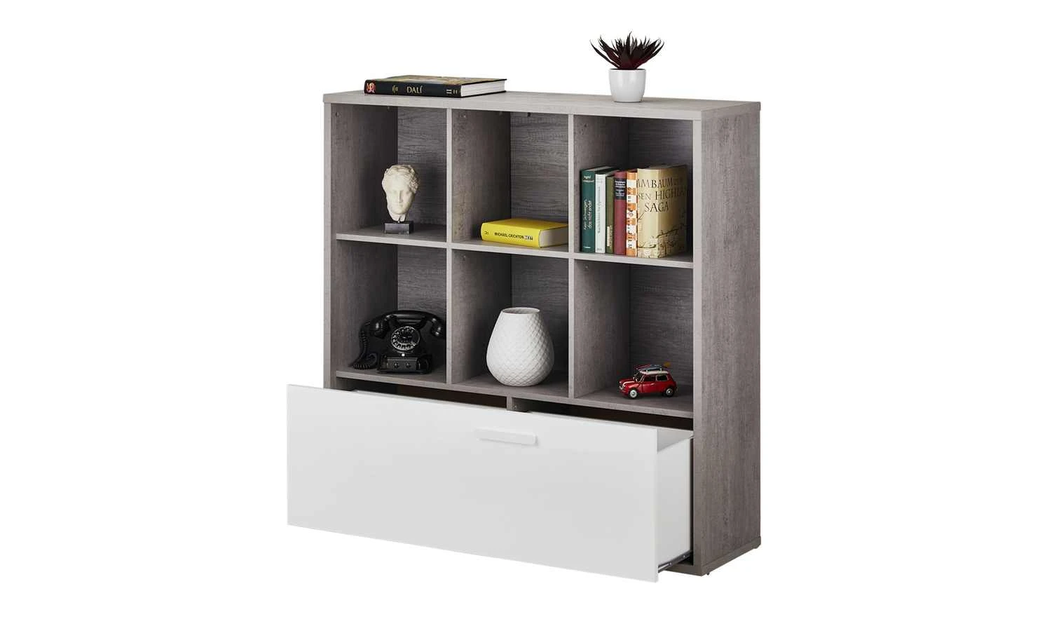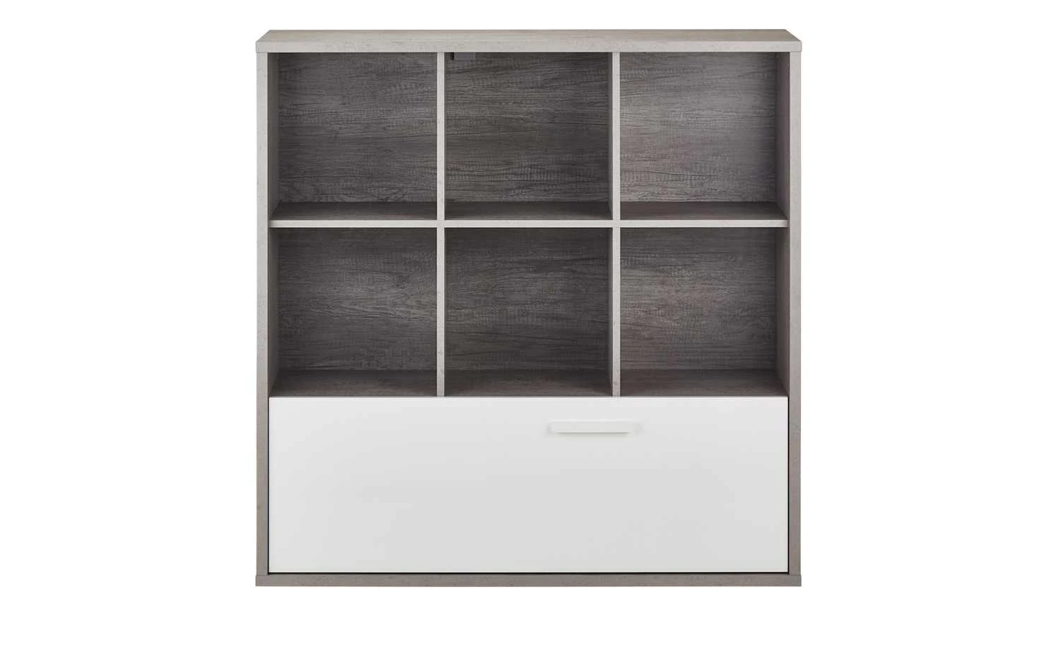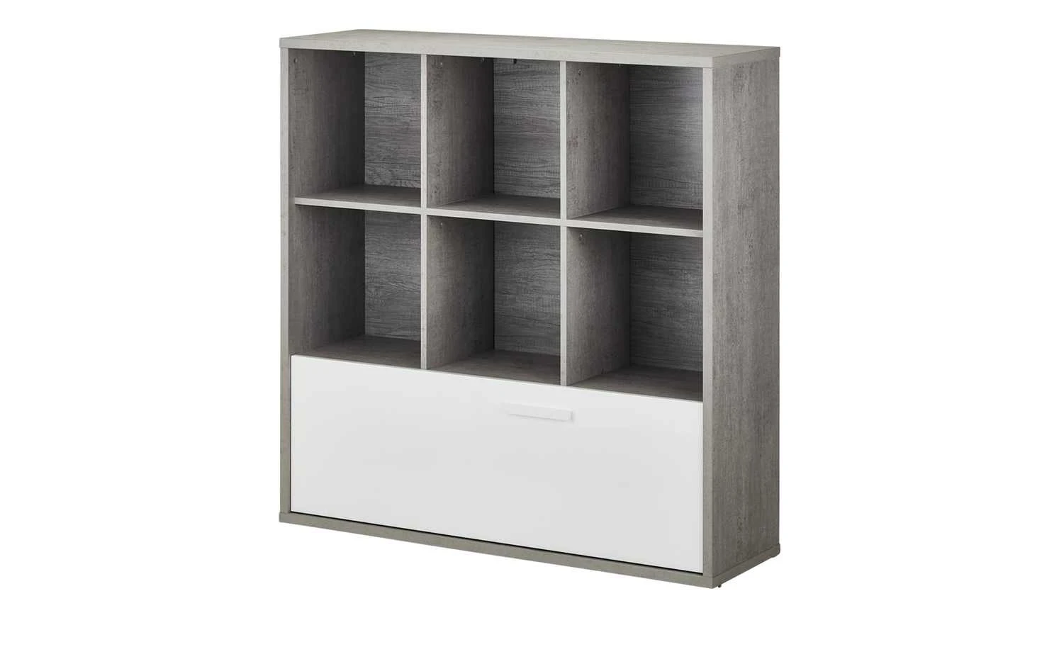 Mit dem Multifunktionsregal Milow schaffen Sie Ordnung im Jugendzimmer. Es verfügt über sechs offene Fächer. Diese können für Bücher, Games oder Deko genutzt werden. Darüber hinaus hat Milow eine Schublade, die sich über die gesamte Breite des Regals erstreckt. Die Schublade ist in Weiß gehalten und hat eine Hochglanzfront. Das restliche Regal besticht mit seiner lässigen Betonfarbe.