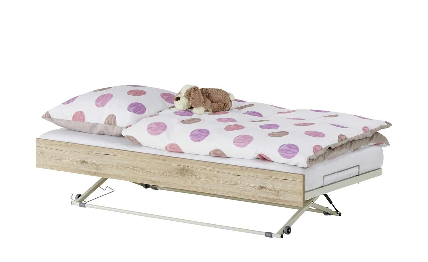- Mehr zu Ausstattung / Funktion: 13 schichtverleimte Federleisten, für Liegen und Etagenbetten aus dem Programm Fionn, wird mit einem Gurt unter dem Bett hervorgezogen und mittls eines, von Gasdruckfedern unterstützten, Mechanismus nach oben verstellt, Universalrollen, Liegefläche 90×190 cm, max. Matratzenhöhe 11,5 cm