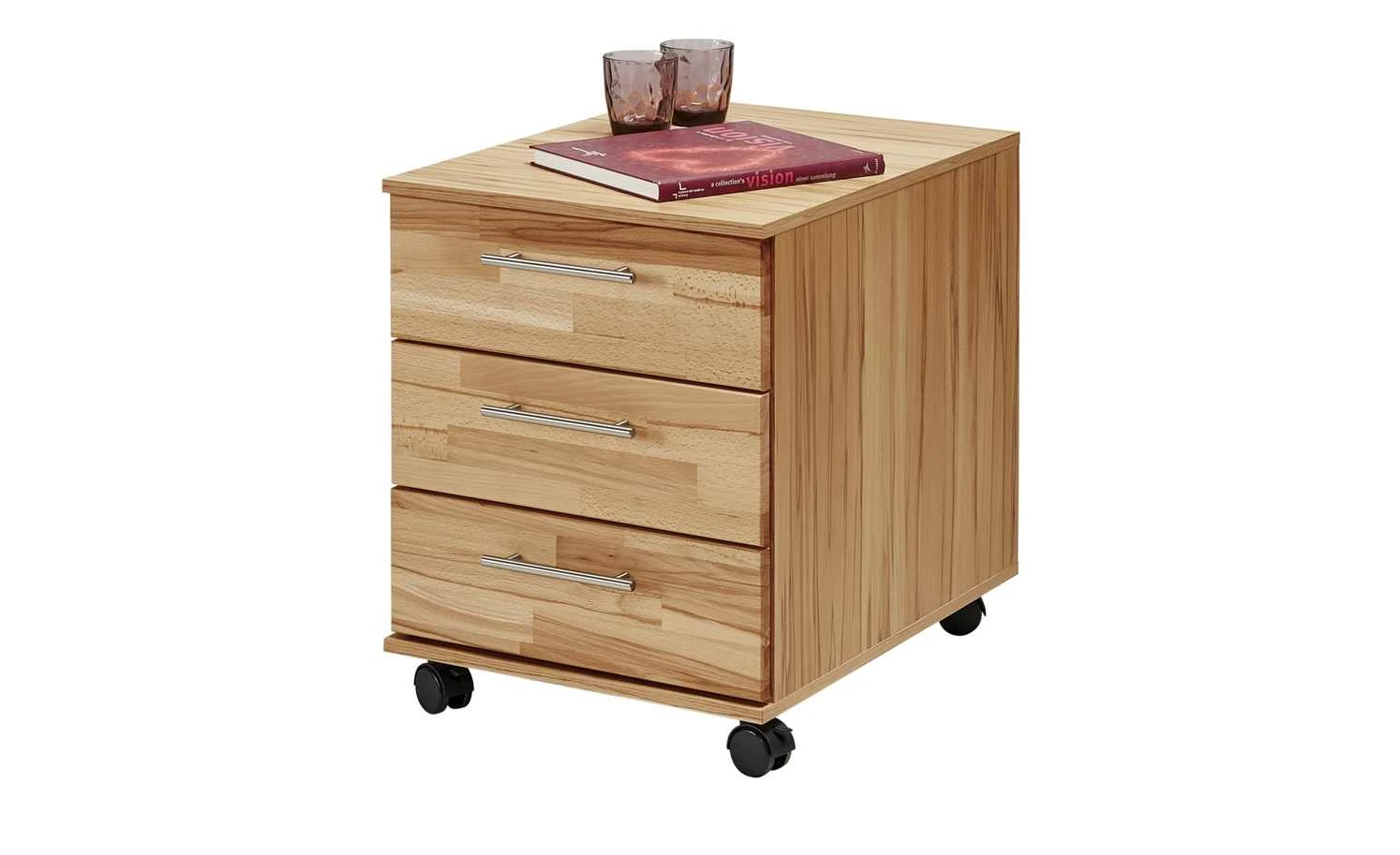 Ob unter dem Schreibtisch oder als Aufbewahrung für jeden anderen Raum, der Rollcontainer Oslo ist praktisch. Dank seiner vier Containerrollen können Sie Oslo einfach transportieren. Die Rollen sind außerdem mit einer Bremse ausgestattet. Oslo verfügt über drei Schubladen für Schreibutensilien. Die Schubladenfronten sind aus massiver Kernbuche.