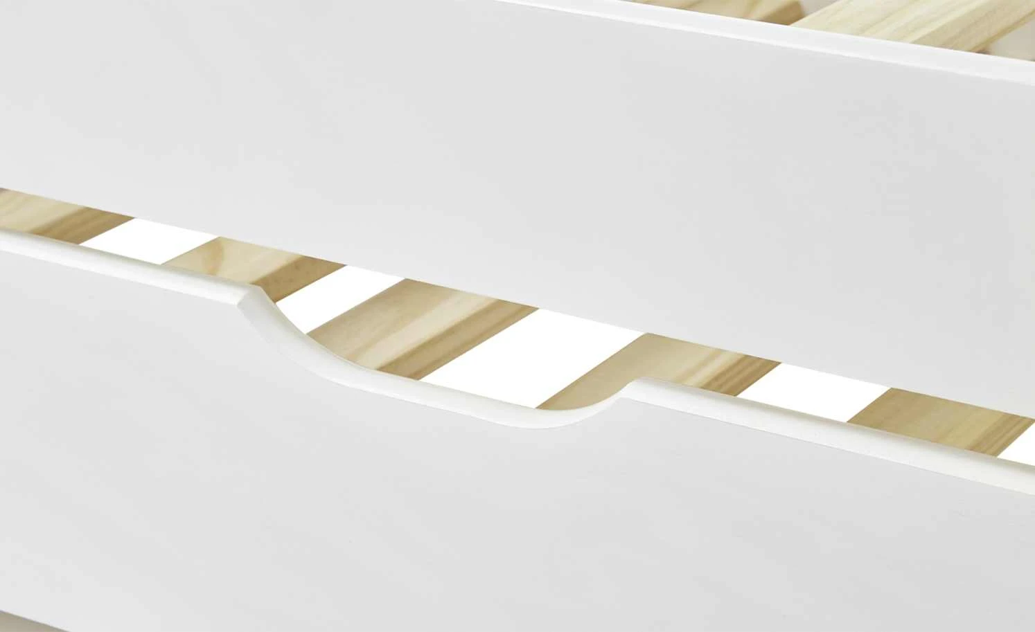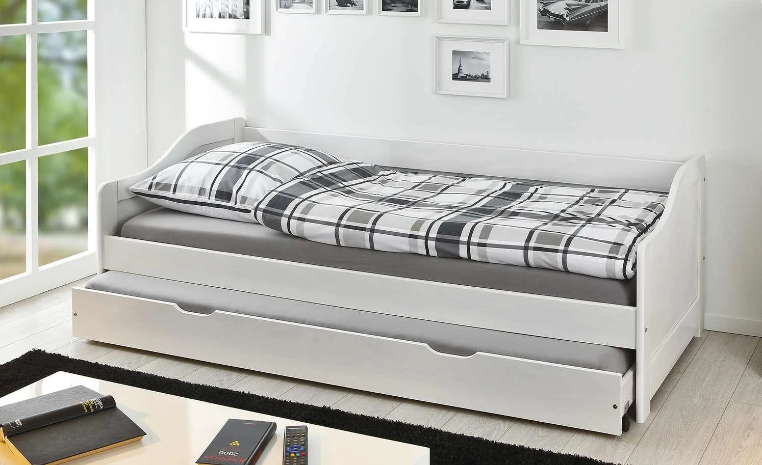 Solis ist ideal für das Kinder- und Jugendzimmer, denn es ist Sofa und Bett in einem. Das Bettgestell ist im Rückenbereich erhöht. Mit ein paar Kissen wird das Bett so zur Couch. Solis ist aus lackiertem Massivholz gefertigt. Praktisch ist auch das zusätzliche Gästebett unterhalb der Liegefläche. Es wird bei Bedarf einfach hervorgerollt. Die passenden Lattenroste sind im Lieferumfang enthalten.