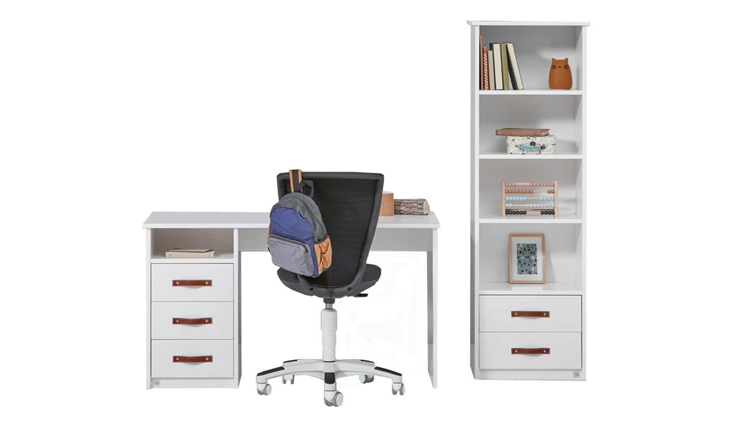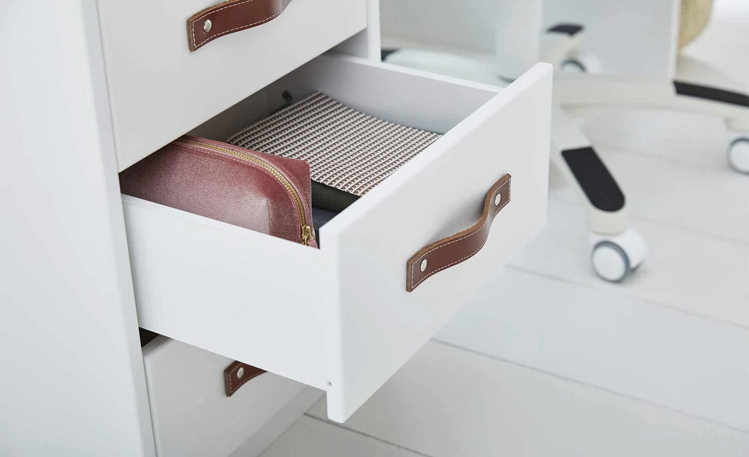 - Mehr zum Material: Korpus und Front: MDF, Weiß lackiert, Griffe: Ledergriffe
