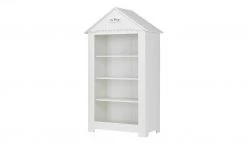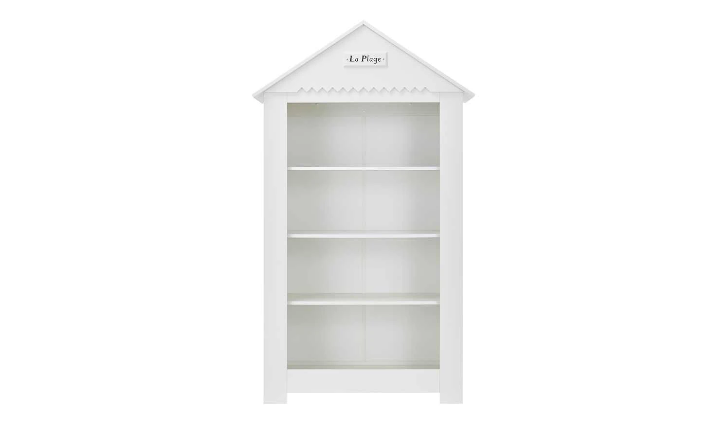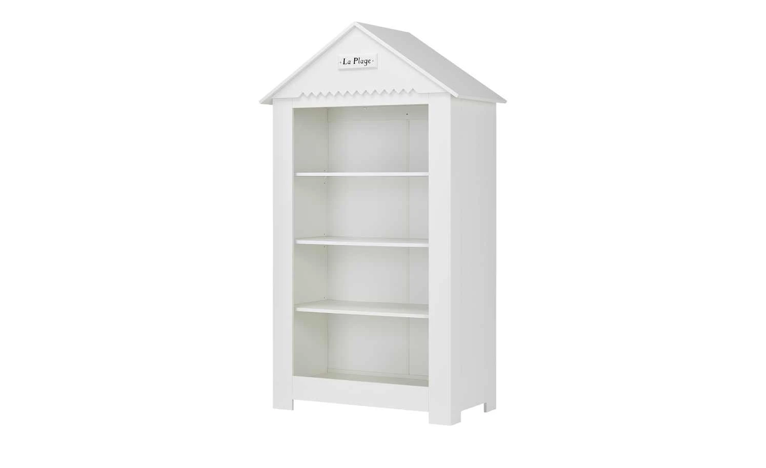 Beim Standregal Mara passt alles: Design, Stauraum und Qualität. Mara erinnert an eine Holzhütte am Strand. Es gibt sogar ein Dach mit einem „La Plage“ Schriftzug am Dachgiebel. Die Oberflächen sind weiß lackiert und haben eine Holzlattenoptik. Stauraum für Kinderbücher, Teddy und Puppe ist in den vier Regalfächern. Sie erstrecken sich über die gesamte Regalbreite von rund 107 Zentimetern.
