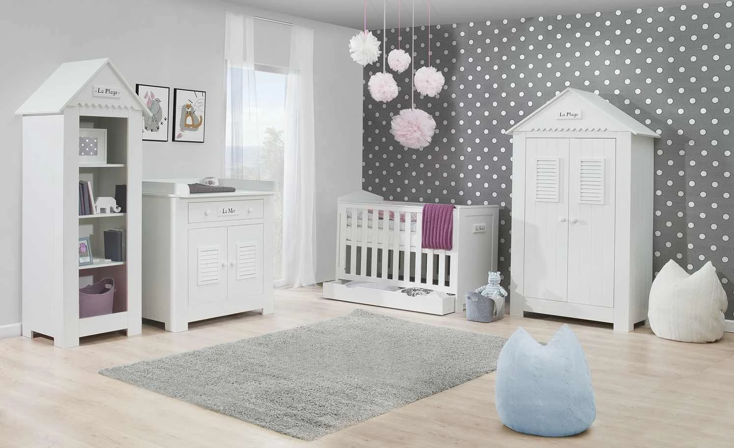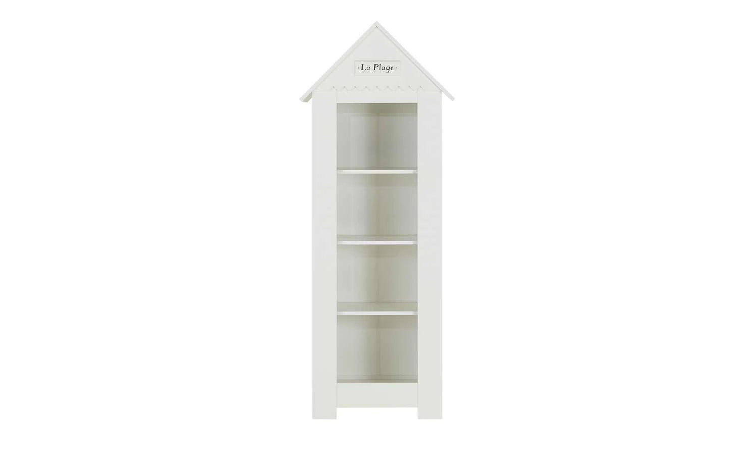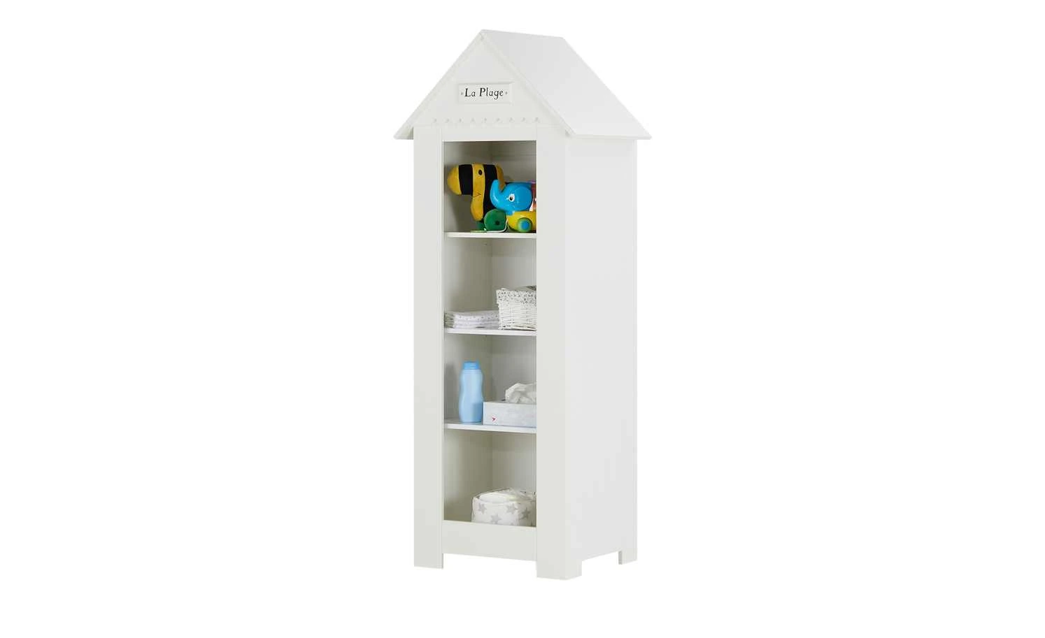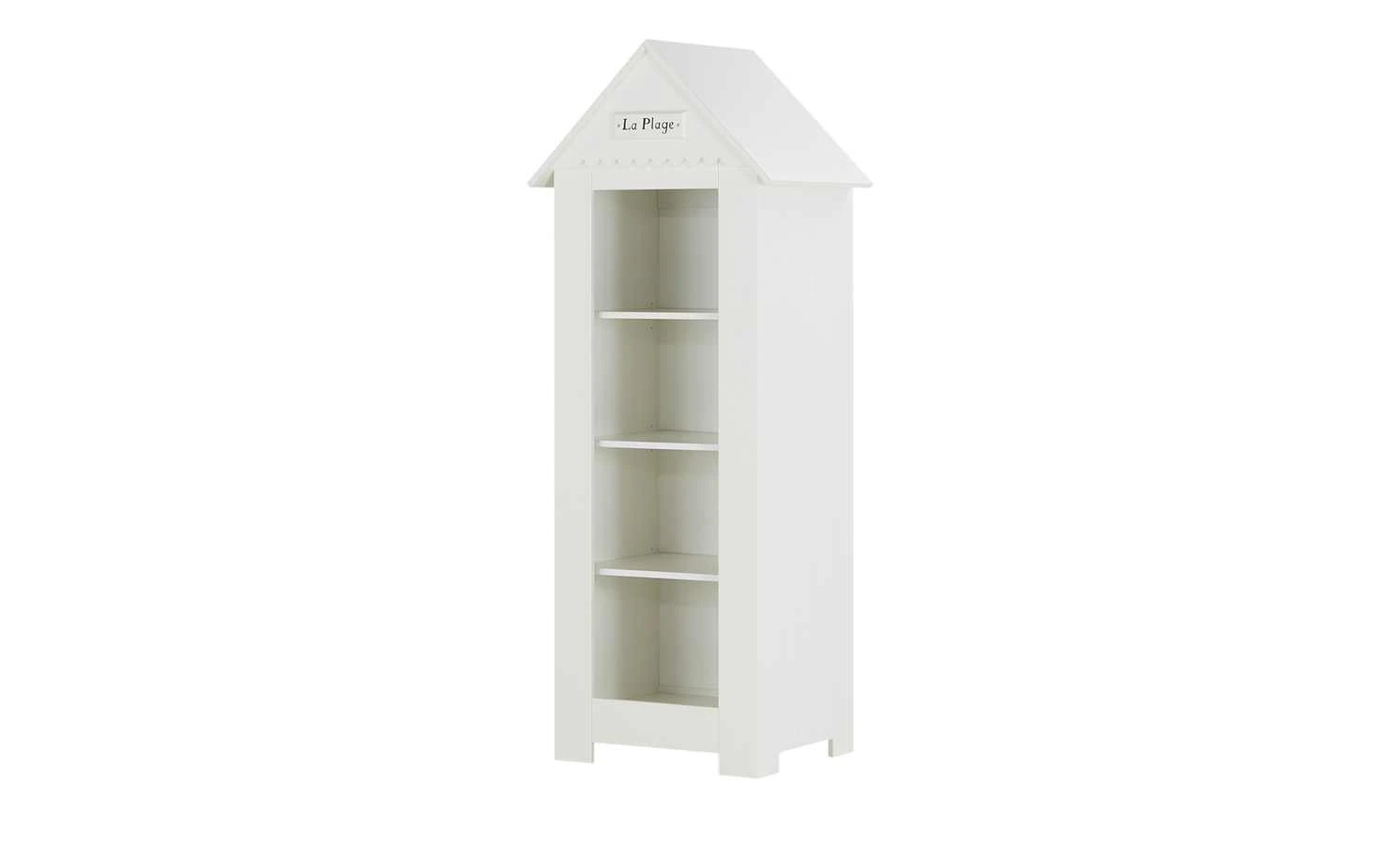 Beim Standregal Mara passt alles: Design, Stauraum und Qualität. Mara erinnert an eine Holzhütte am Strand. Es gibt sogar ein Dach mit einem „La Plage“ Schriftzug am Dachgiebel. Die Oberflächen sind weiß lackiert und haben eine Holzlattenoptik. Stauraum für Kinderbücher, Teddy und Puppe ist in den vier Regalfächern. Sie erstrecken sich über die gesamte Regalbreite von rund 72 Zentimetern.