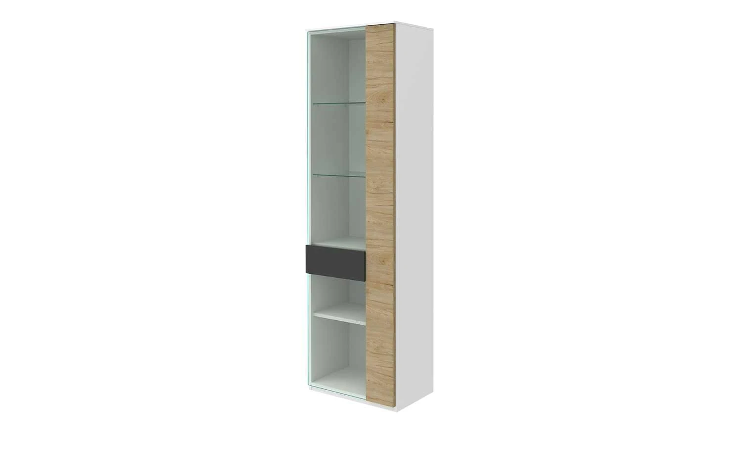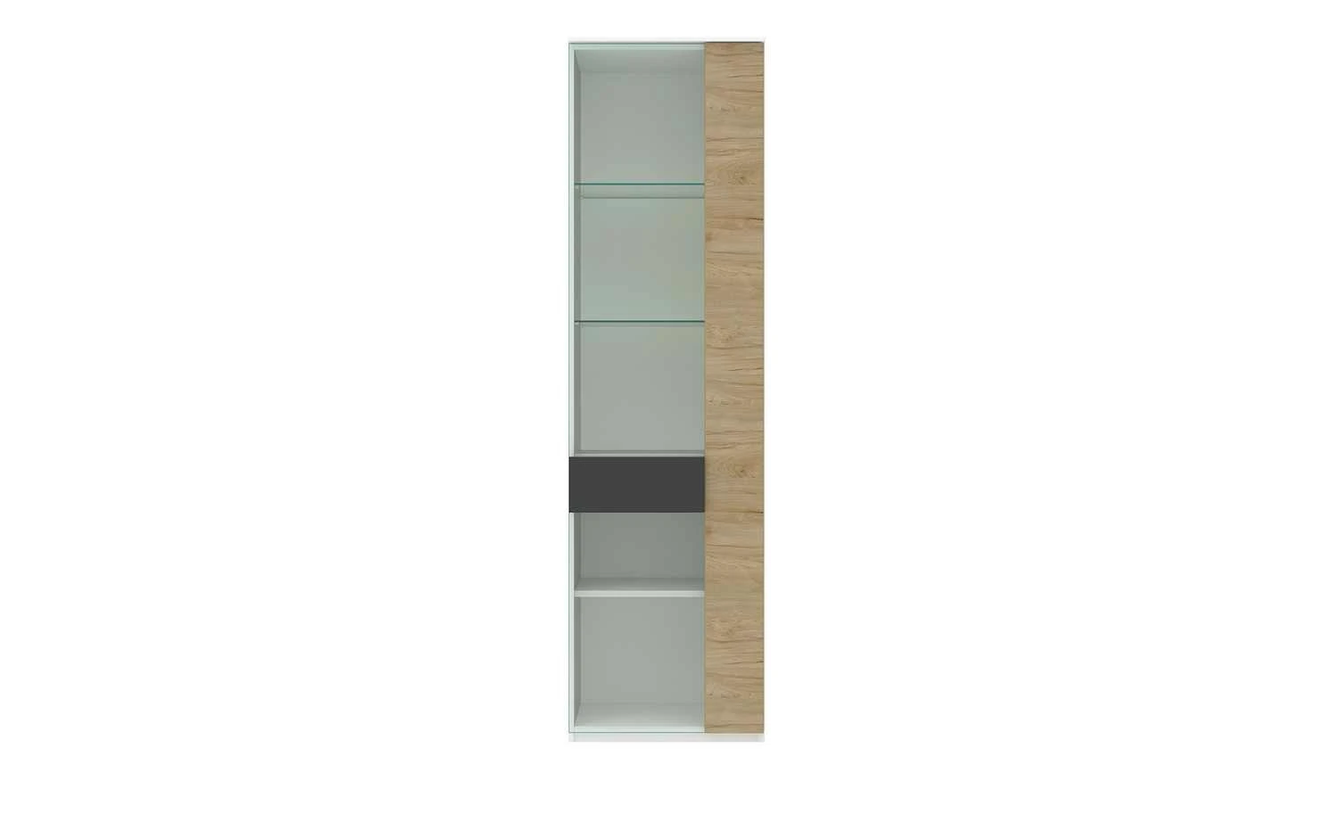 - Mehr zu Ausstattung / Funktion: Front: 19 mm stark mit ABS-Kante, 2 Holzböden unten, 2 Glasböden oben, Drehtür mit Metall-Topfbandscharniere mit 110 Grad Öffnungswinkel, Korpus: 16 mm stark mit Dekorkante